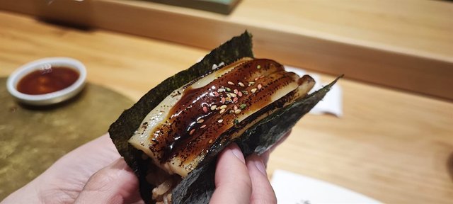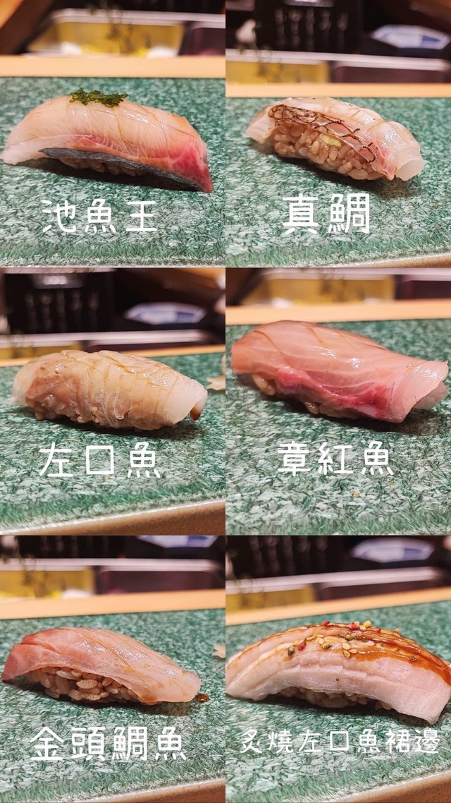 跟住就係壽司七貫,大部份都係魚生壽司分別係池魚王,真鯛,左口魚,章紅魚,金頭鯛魚,左口魚裙邊 (灸燒)同埋星鰻手卷。