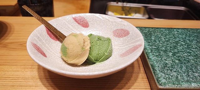 最後就係甜品啦!師傅拎咗兩盒雪糕出來,係抹茶味同拖肥糖味,比較出色嘅係個抹茶味,食落好有京都抹茶嘅味道!