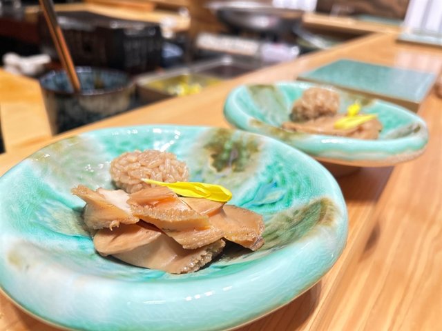 第三道菜係我期待左好耐既矶煮鮑魚配鮑魚肝醬! 食落都有咬口同味道較前兩道淡味,不過整既過程無論係揀同煮既過程客人都可以望住,連擺盤用既裝飾花師傅都好細心禁揀完再放上煮好既食材上面!值得一讚~👍🏻