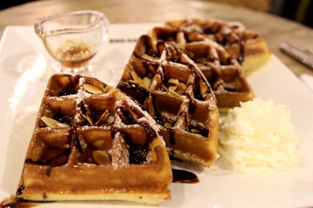 松软的松饼搭配枫糖和天然淡奶油 表面淋上糖霜和杏仁碎片 简简单单的就很美味了