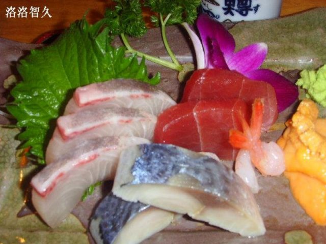 落坐,看了午市的MENU~天热啊,还是吃刺身套餐吧~~嘿嘿,偶是不怕H1N1的~刺身套餐价是68RMB~~有2片金枪鱼,3片白金枪鱼,一些海胆,甜虾一只,还有MS是鲷鱼(偶不认识,偶承认偶是鱼盲,只要是鱼,洛洛偶都欢喜额),刺身很新鲜,每片都厚厚哒~
