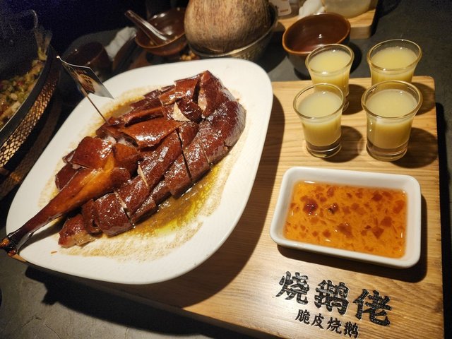 午市人聲鼎沸,我們被安排坐在卡座。點了半隻燒鵝、鑊氣小炒和時令黃皮汁。燒鵝上桌時油光晶瑩,師傅刀工精準,鵝皮如琥珀般透亮。夾起最肥美的鵝髀部位,咬下時「咔嚓」聲清脆悅耳,父親驚喜地挑眉:「這脆聲,比香港很多店都出色。」