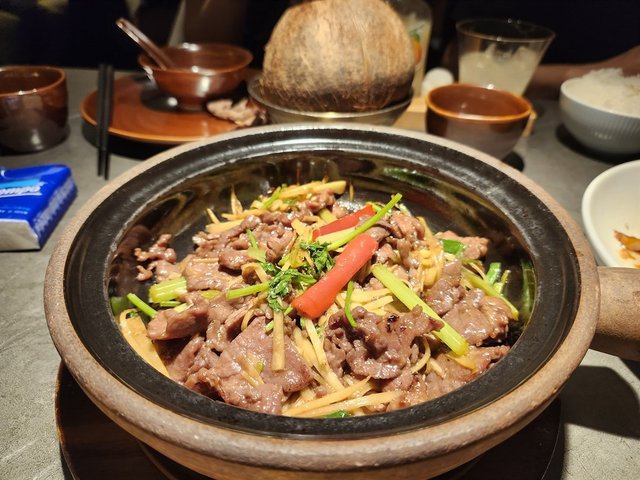 鵝肉肥瘦恰到好處,秘製滷汁在齒間流淌。我特意將蘸了酸梅醬的鵝件放到母親碗中,她細細品味:「皮脆肉嫩,連骨頭都入味。」鑊氣十足的炒黃牛肉鑊氣熏人,牛肉嫩滑得不像全熟,醬汁濃郁惹味,配著絲苗白飯,父親竟破例添了半碗。