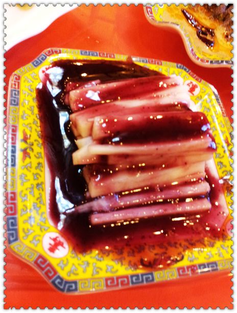蓝莓山药~ 山药切成大小不等的长条码放盘中,蓝莓酱比较稀,浇在山药上肆意流淌,整个制作显得很粗糙~~