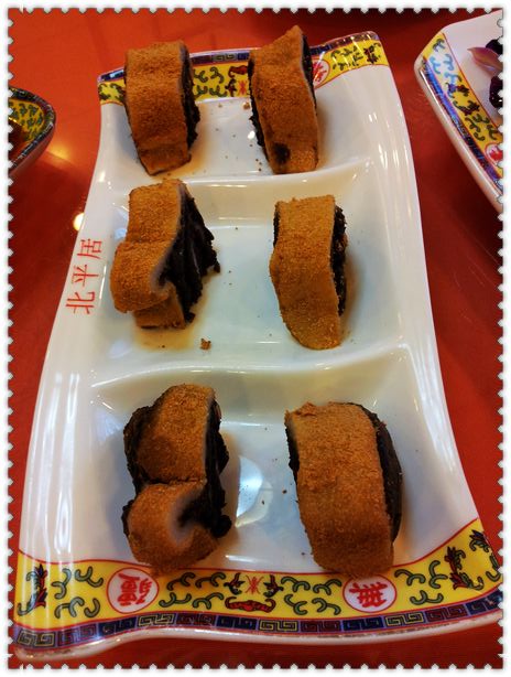 炸灌肠~ 炸得非常酥脆,本身并没什么味道,沾着蒜汁儿来吃~ 这是北京春节庙会必有的一道小吃哈~