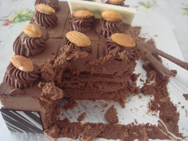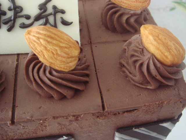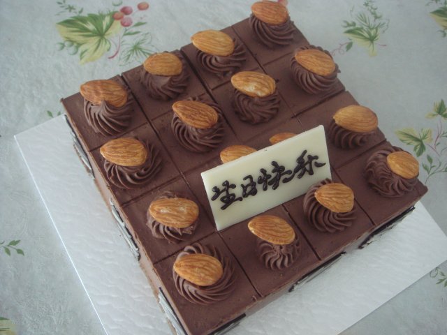 打开之后可以看到订购的巧克力杏仁的蛋糕,上面还给划了痕迹,便于切,不过这样也破坏了整体的美感。