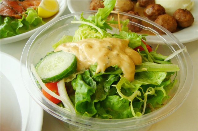 【蔬菜沙拉】(6.9)生菜,黄瓜,小番茄,还有我不认识的菜~~加的丘比千岛酱~味道可以~~还是喜欢素食。。