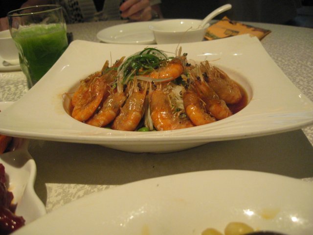 茶香虾,上面铺了一层虾,虾头是百叶丝、青毛豆神马的。虾的壳炸得脆脆的,里头的虾肉还是老鲜嫩的,但是名为茶香,我却没尝出啥茶味来。下面铺的百叶丝,吸收了虾的鲜味,超级好吃,我吃了好多哦,都快觉得它比虾还好吃了,呵呵!