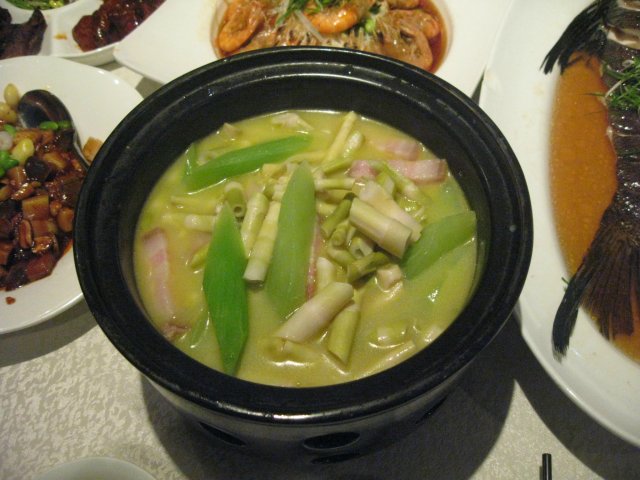 咸肉高汤笋尖煲,里面放了咸肉、笋尖、莴笋,看起来很清爽的一道菜,高汤的颜色看起来醇醇的,笋尖本来的清香,再加上吸收了高汤和咸肉的味道,真的一级棒啊!
