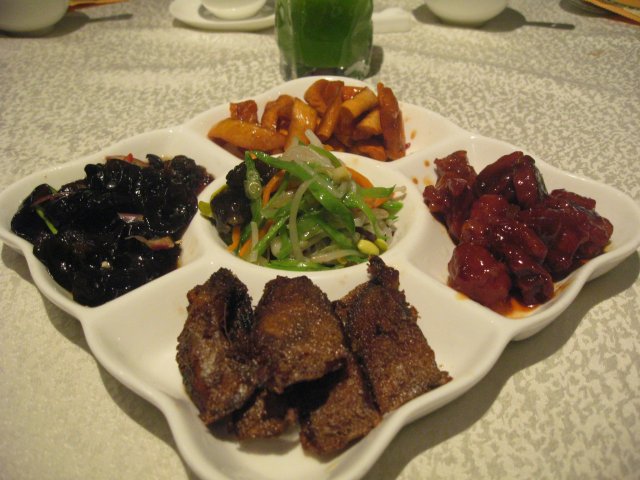 冷菜,装在一个小拼盘里端上来,有糖醋小排、熏带鱼、酱萝卜、芥末木耳和凉拌青椒豆芽。摆盘挺漂亮精致的,带鱼的味道很不错的,做法有点跟我们平时吃的熏鱼一样,但是把青鱼换成了带鱼,感觉口感更细嫩。糖醋小排,小排上的肉肉不少哦,骨头旁边的活肉,最好吃了,糖醋的味道,我觉得有点偏甜了。酱萝卜,很爽脆,喜欢。另外两个也清清爽爽的。