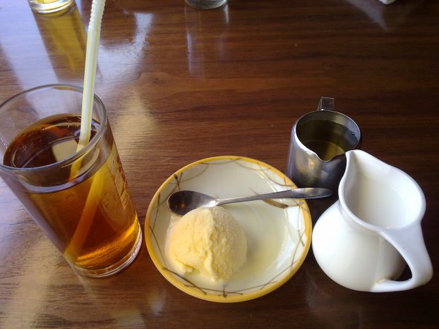 服务员这时才送上免费的红茶,配了奶和蜜糖,还有一小份冰淇淋。冰淇淋当然很一般,奶倒还不错,超码不是奶精。