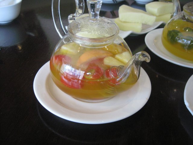 水果茶,里头有苹果、橙子、圣女果等,我觉得口味偏甜了。