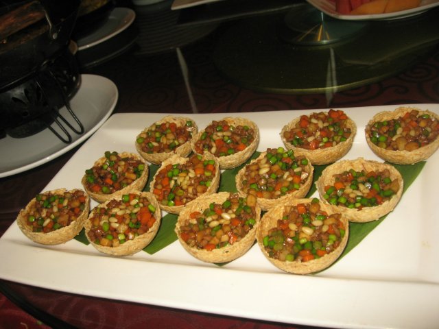 五彩鱼粒,不知道是不是这么个名,反正是把鱼粒和各种粒粒装在面粉做成油里炸过的小碗里,从里到外都能吃,鱼粒微微有些腥。