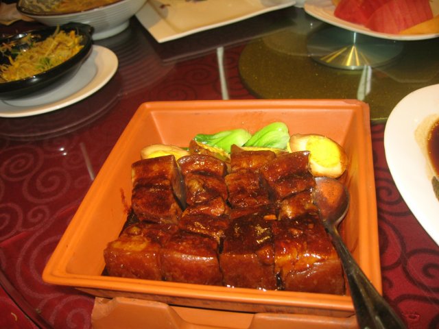 红烧肉烧蛋,我吃不下红烧肉了,挑了半个蛋尝尝,很入味的说。