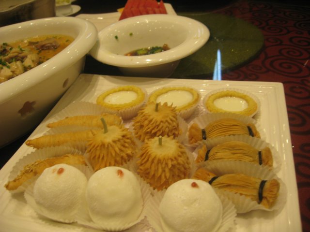 点心拼盘,有雪梅娘、榴莲酥、蛋挞、萝卜丝饼等,我吃了个榴莲酥,好吃哦,造型就很精致,酥皮超香酥的,里面的馅儿也做得很细。