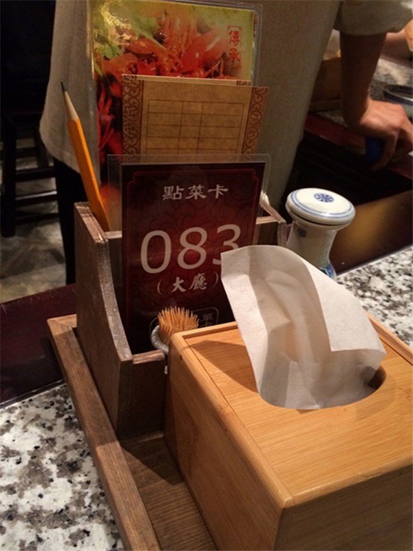 桌椅之间密度比较小,坐着有点促狭。一开始不太明白那个点菜卡什么的怎么用,最后还是按照常规叫人来点菜的( ̄▽ ̄")