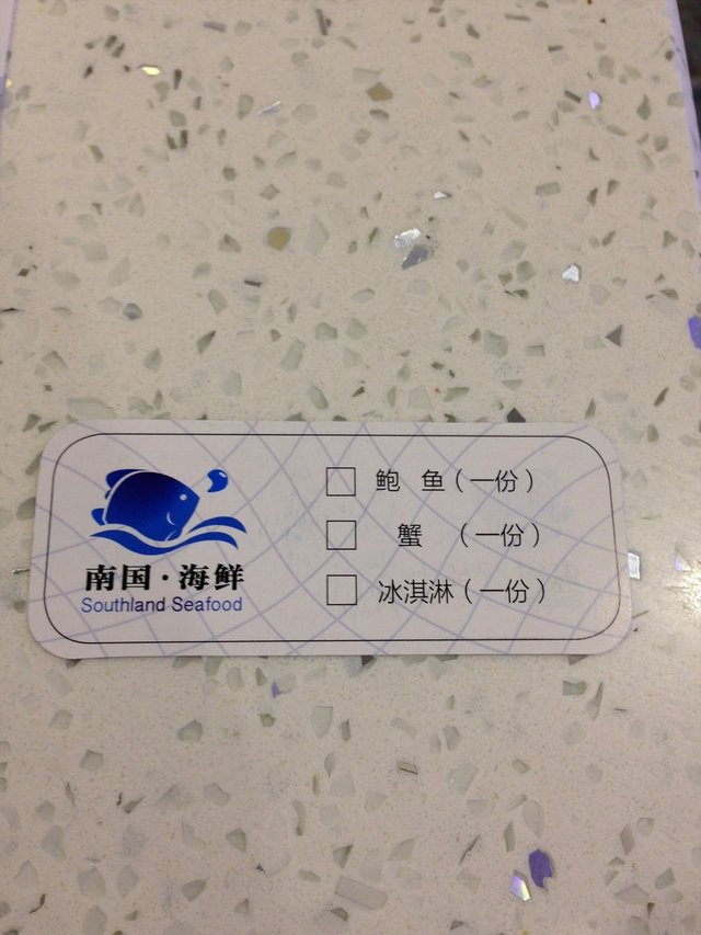 进去会给你一个小的纸片,上面有三样东西写在上面的。鲍鱼、蟹、冰淇淋。这个意思就是限量了的,要凭这个去领取一份的。