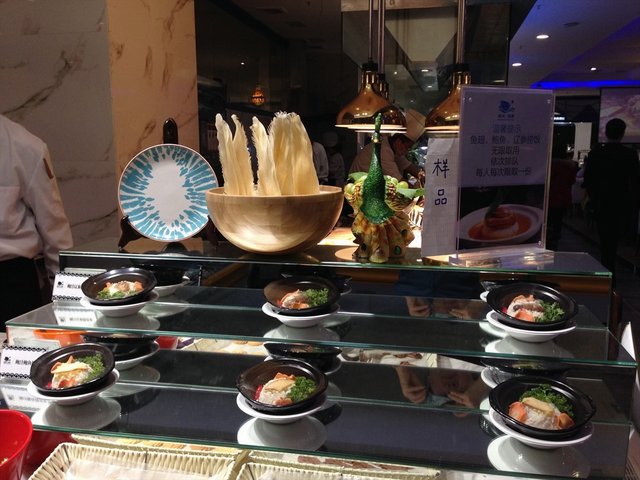 座位区域的左手边又是菜品区域,有蔬菜区域,烧烤区域。还有一个鱼翅、鲍鱼、辽参捞饭区域,无限区域,一次只能领一份。