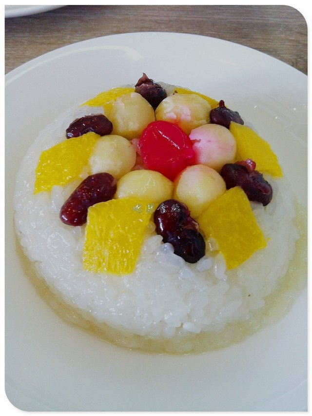 上海本地八宝饭,感觉没有八宝,红豆、莲子、樱桃、水果,加上白米饭,米饭很糯,挺精致的。