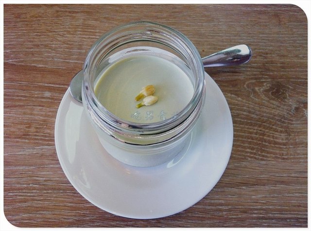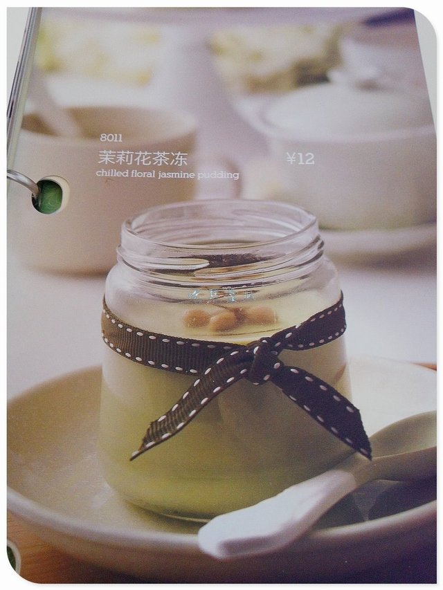 茉莉花冻茶,其实就是抹茶布丁,上面点缀着两粒茉莉花苞,和上面的芒果冻布丁属于一个系列,比芒果冻布丁甜度低得多,而且抹茶的味道相当不错。