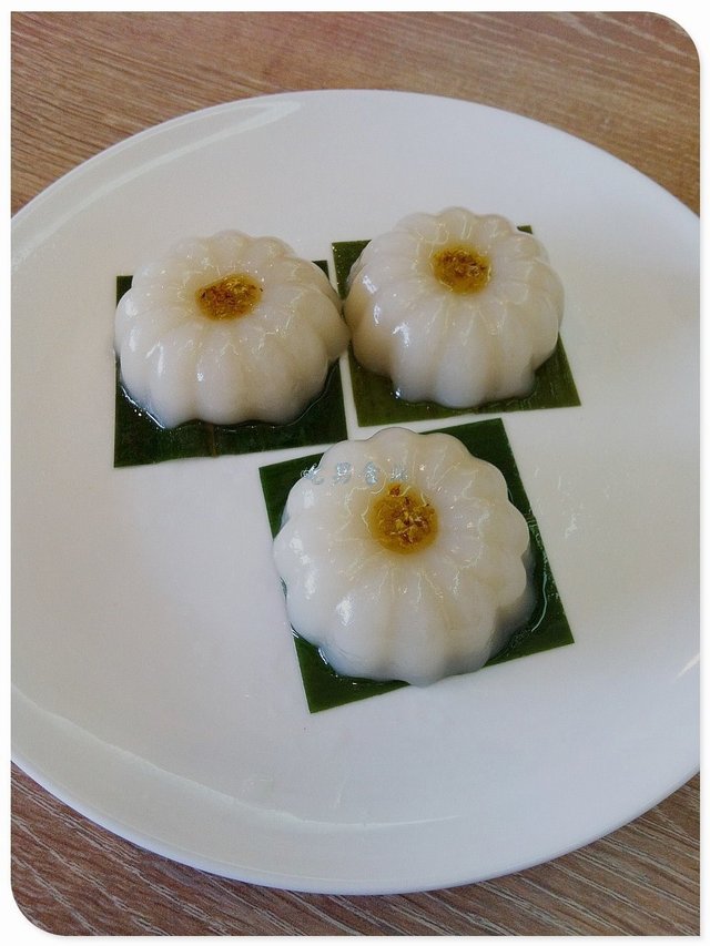 桂花蜜拉糕,卖相特别精致,三个糯米糕放在荷叶上,糯米糕中间还放上了桂花甜液,口感不错。