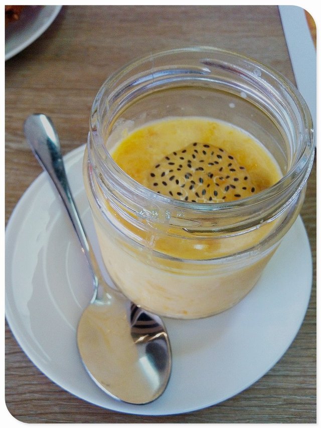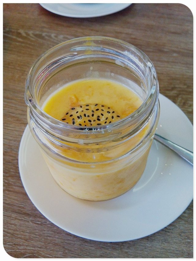 甜品选了芒果冻布丁和桂花蜜拉糕,芒果冻布丁是实在的芒果肉混合布丁制作,吃的时候可以很明显吃出里面的芒果肉粒,容器是透明的小罐,味道很好;