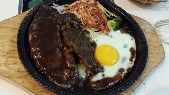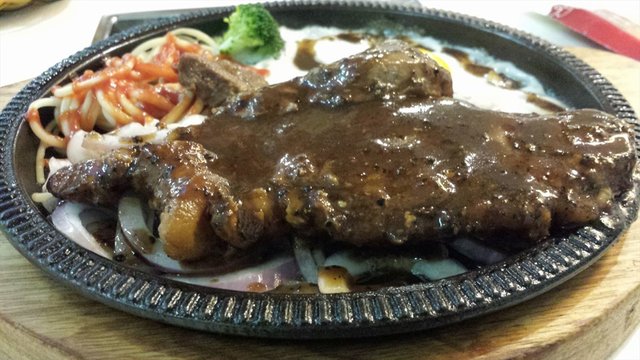 沙朗牛排59米,牛排块头挺大,品相一般,酱汁有点黑,味道中规中距的。