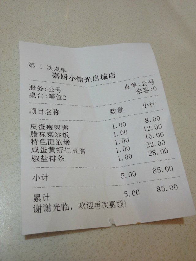 去这家店吃饭实属偶然,那天正当饭点,面对其他餐厅门庭若市唯独只有这家店没有排队,甚至还看到了一张4人坐的空位,抱着试一试的心态和朋友2人走进了餐厅。菜单上的价格绝对会让你眼前一亮,就光启城4楼5楼的餐厅来说,也许这家店的价格是最平民的,我们粗略的点了几样还算家常的小菜。