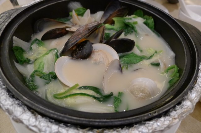 @无油鱼汤浸时蔬/38块,这个看图片就看到好多贝壳类的,虽然不大喜欢吃,不过既然那么多人推荐么,那就试试看吧~里面的蔬菜还挺多,应该是青菜+大白菜,汤么味道也还不错,不过里面那些蛤啦之类的我倒没怎么吃