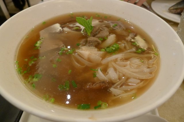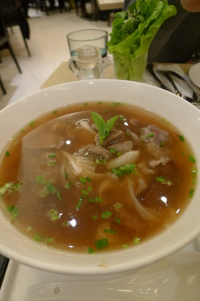@越南火车头河粉/40块,刚上来啊的时候发现东西不多么,一碗里面大概有好几片牛肉,牛肉虽然比较厚,但是比较老。。。里面的河粉还蛮好吃的,软软的,我也吃了一小碗了,他旁边给的生菜什么的原来需要自己剪一剪扔到汤里面,我们都不知道,后来服务员帮我们剪了。。。