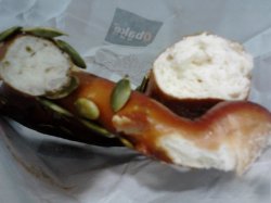 葵花籽面包,很紧实很敦实的一款,个头不是很大,是方形的,中间是满满的葵花籽,面包的口感很像蛋糕,所以一个要400多克呢,20米左右吧~不过感觉没什么吃头,就是很普通的粗粮面包,不太推荐的~