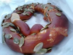 南瓜籽扭结是最爱的一款了,面包的口感很紧实的,是真的紧实,看看细节图就知道了,像高庄馒头一样的,老好吃了~很香的,外面的南瓜籽很多的,看上去是不是很大的一个,但是拿在手里很有分量的,而且这款冷掉了口感一点都不影响的,同款有原味的和芥末的,现在芥末口味的好像看不到了,10米左右一只,性价比蛮高的~