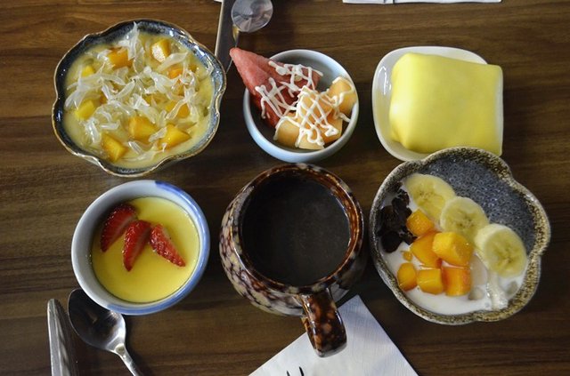 港式甜品【白雪黑珍珠】,台湾甜品【芋圆红豆汤】,【焦糖布丁】,【水果沙拉】,【牛肉干】,【芒果班戟】,甜品小吃应有尽有。