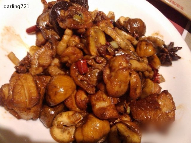 【香菇板栗鸡】名人菜,之前有做功课说他家三杯鸡不出彩,所以才点的这个,微辣微咸口,花椒放了很多,味道比较怪,只有香菇入味,总评一般~~