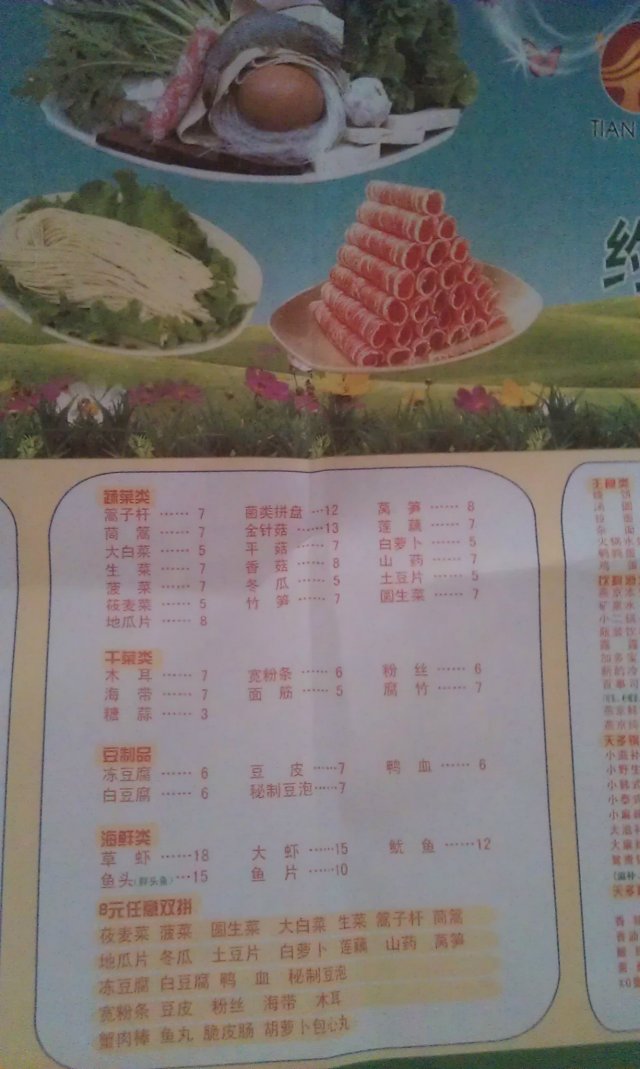 蔬菜这些其实大同小异,只要新鲜、干净卫生在哪里吃都是一个味道的,他们家的比较新鲜。酱料有三种好象,麻酱的、香辣酱和香油蒜蓉,而且是免费的,锅底也是免费的,这点很不错的。虽然品种少了些,也没有特别自创的底料,但随意吃吃还是不错的。牛羊肉这些,看着也不错,应该是真的肉,吃着也还好,没看出有啥差别。