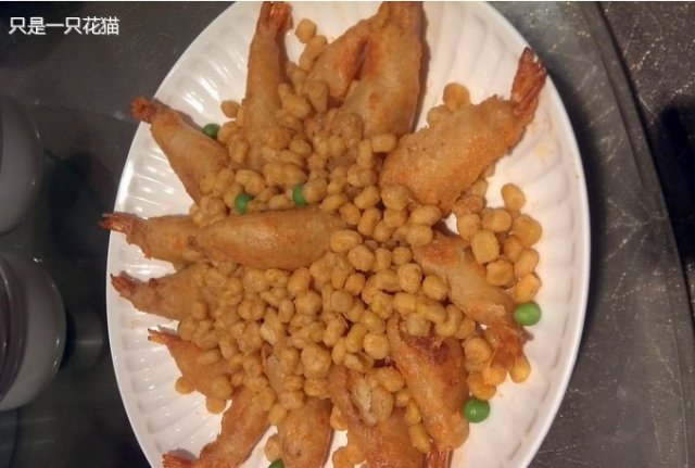 金沙脆皮虾,摆盘很漂亮,78元一份,虾肉很嫩,就是太腻,油吸入的过多,吃一个刚好,中间是炸的金色的玉米粒,整个造型非常好看,