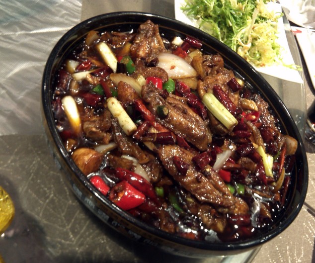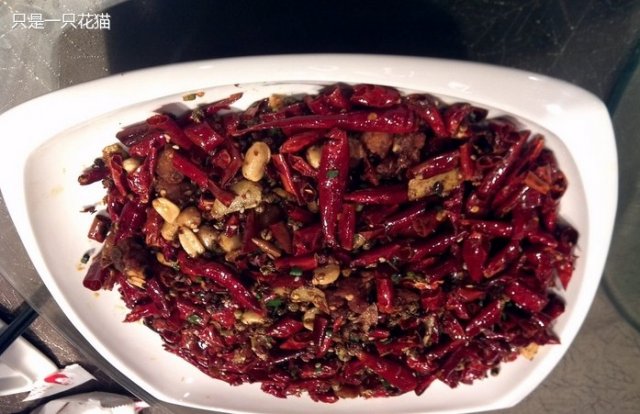歌乐山辣子鸡52元一份,上来一盘红彤彤的辣椒,鸡肉块要在其中寻找,味道很正,美中不足就是鸡块太小了,吃着不过瘾,炸的微微有点干了,要是能把几块上浆后猛火炸,这样保证鸡肉外交里嫩口感就更好了,