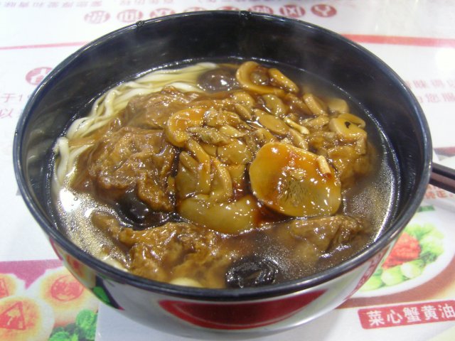 双菇自然是平菇和蘑菇,用酱油烹饪的,和面筋一起作为浇头浇在面上。平菇是柔嫩的,蘑菇则是滑嫩的,浓香的酱油让它们更加入味。面筋并不是我们常常吃到的那种圆形的面筋,而是有些厚度层次和质感的,口感上其实更像是素鸡,味道也是酱香的。面条就是一般老百姓家经常会吃的那种挂面。虽然浇头的味道很合我的口味,但是对于面条,我还是吃不了太多。