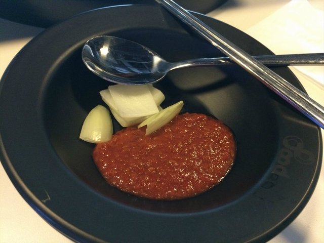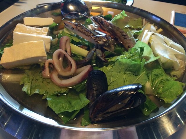 入座后服务员立马端上了个海鲜锅,还心想,根本没有点,怎么会来个海鲜锅。原来他们家任意消费就送海鲜锅。里面的东西还蛮丰富的。海鲜有青口贝啦,虾,蟹,还有贝壳类。东西看起来还不少。泡菜和各类金针菇/简易的蔬菜都是送的。