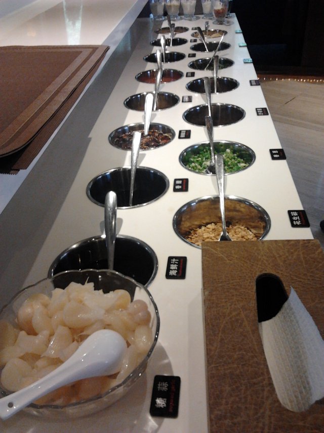 自助的小料区看着干净,整洁,清爽。各种小料配料种类很多,很新鲜,芝麻酱很浓,很香,花生碎清脆爽口。这里的糖蒜都扒成了蒜瓣,酸甜可口,吃着很是清脆,颜色白白嫩嫩的,非常好吃。