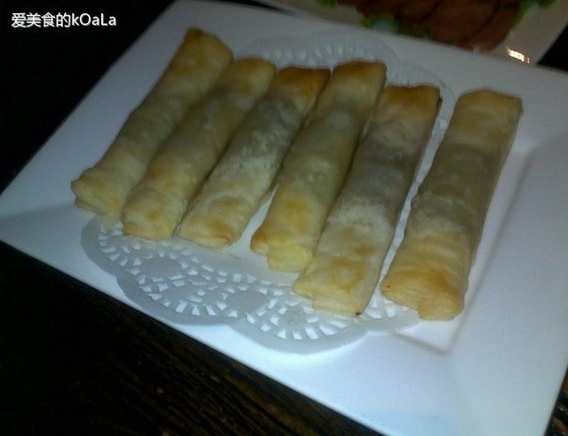 一份六个,细长条形,外层的酥皮真心做的不错,不比任何一家粤菜馆要差。。。不过素菜的叉烧只是一种叉烧色的酱类物质微甜可能是想体现叉烧那种略甜的口感吧,不难吃,不过也不是很喜欢里面那个酱。