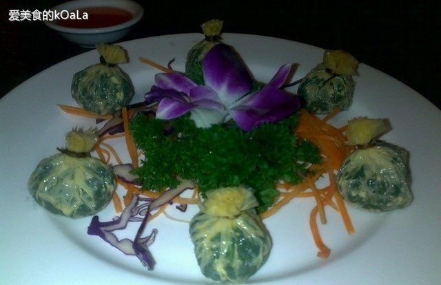 好听的名字,精致的摆盆,超级普通的菜,六个鸡心形状的白豆腐中间挖出一个凹陷,里面放着用各种素菜切成碎末的东西,上面浇着绿色的酱汁,花哨而不好吃的菜!