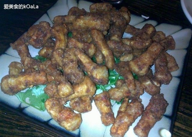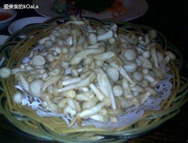 我的胃就是招了这道菜的罪了~据叮叮说上次吃到的是把菇的根部切成细条,沾上粉油炸做成辣味的~菇的根部很有嚼劲而且入味,一试之后发现根本不是这么回事~很粗的根部根本没有被处理过,咬上去很硬,除了辣味还有孜然味~点都点了又不能浪费,这么不消化的东西整份下去,我可怜的胃啊~一个星期都没缓过来!!!