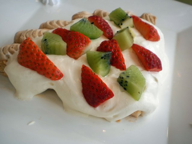 (鲜果蛋白饼)样子很好看,上面都是大大的草莓点缀,蛋白打了很松的,入口即化,下面是类似松饼一样的东东,但是带有甜味的,闺蜜特别喜欢吃。