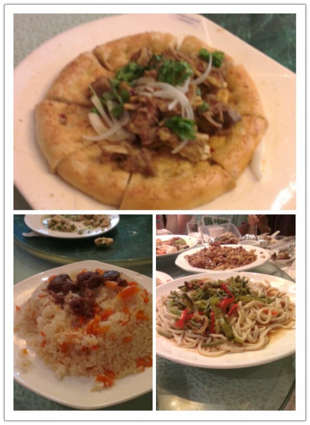 馕包肉,那特别好吃,一定要趁热哦,手抓饭,米粒劲道香甜,但羊膻味有点重,拉条子,面条劲道,灰常地道好吃