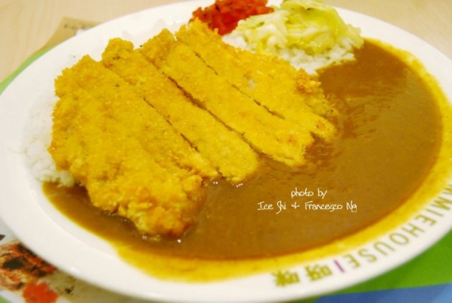 和风猪排咖喱饭,一块炸猪排配上咖喱,这个咖喱就没什么辣味道了,猪排味道还是很不错的,蛮嫩的。。。