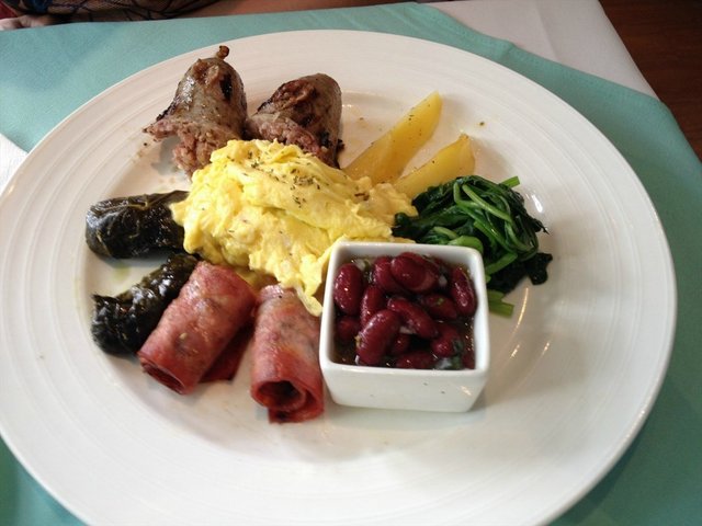 小张的早餐88元,看着空空的,其实量很给力,一个大香肠一切二,旁边还有土豆,糯米,慢慢吃,吃撑了他。