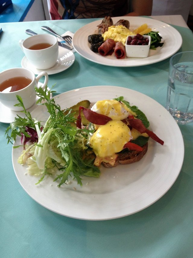 我的先上了,色面很不错,78元的价格,不比kabb的出品差。蛋是流黄的,底下垫了少许的金枪鱼,蔬菜,还有一片全麦面包,很实在。