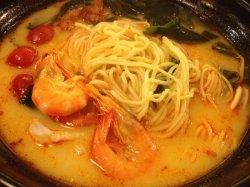 冬阴功拉面,绝对重口味,汤头非常正宗,很辛辣,吃到后面一身汗,里面的料很丰富,有基围虾、鱼肉、鱿鱼、肉糜、海带、小番茄,面条也非常有弹性