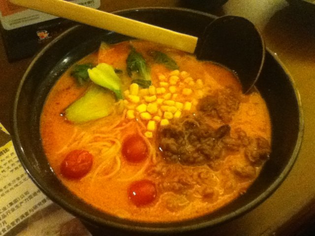 这个非常滴开胃,因为是酸滴,明显价格上去了,料的种类也比味千拉面多一点,一点玉米粒,一点青菜,三个小番茄。吃他们家完全是图快而已,填饱肚子